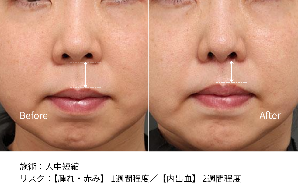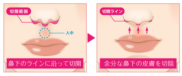 鼻の下を切開して余剰な皮膚を切除することによって、鼻の下を短くし、顔のバランスを整える手術です。鼻下がたるんでいる方の多くは、上唇も下垂しやすいため、上唇のボリュームがなくなったり、上唇の厚みが薄くなっている傾向にあります。人中短縮は、 鼻下全体を引き上げることにより唇も上向きになって厚みが出るので、鼻の下の長さを短くするだけでなくリップリフト効果も期待できます。