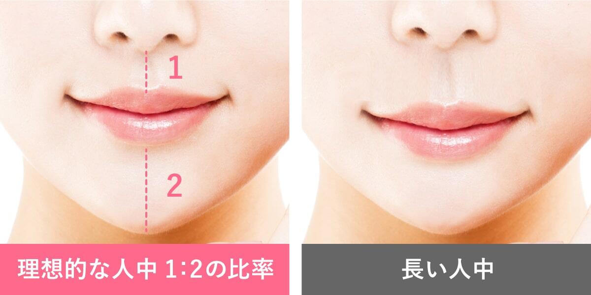 好みなどにもよりますが、一般的には人中とアゴが1:2の長さが黄金比と言われています。具体的な長さで言うと、人中の長さが15mm位までが正常、20mm以上で長いと言われることが多いです。黄金比に近づけるような顔のバランスにしていくことで、若々しい顔になることができます。