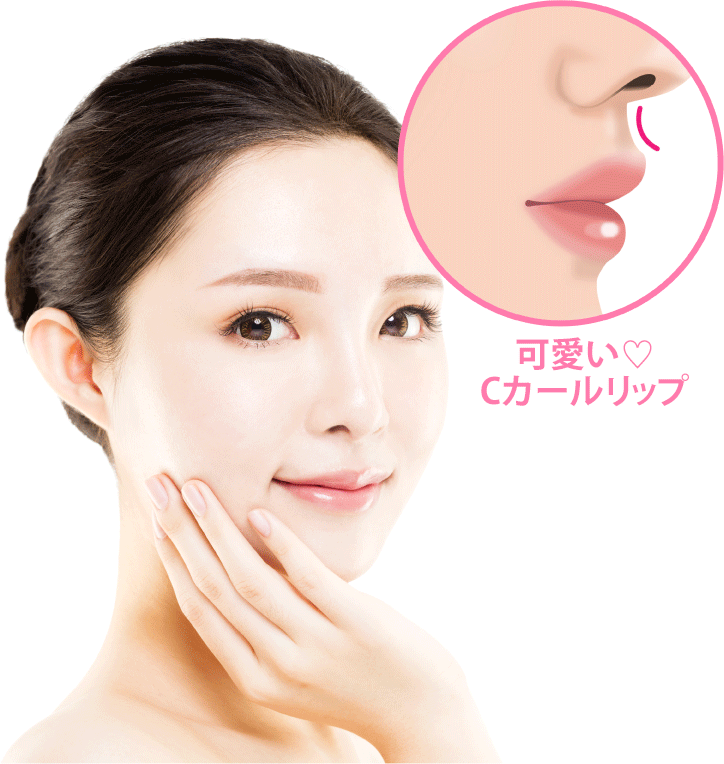 筋肉を切らない術式を採用しているクリニックもありますが、オザキクリニックでは、口輪筋を鼻の根元部分の硬い組織にしっかり固定する術式を行います。しっかり筋肉処理を行うことで、表面のみのリフトアップではなく、筋肉から口元をリフトアップし、若々しい口元と横から見ると可愛いCカールの上向きリップに仕上がります。
