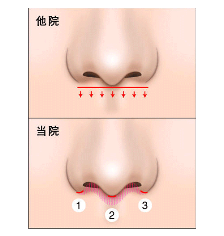 傷跡最小化をとことん追求しています。鼻の形に沿って切除していくため、通常一本線で露出してしまう傷跡が、3箇所の点でしか露出しないよう仕上げていきます。