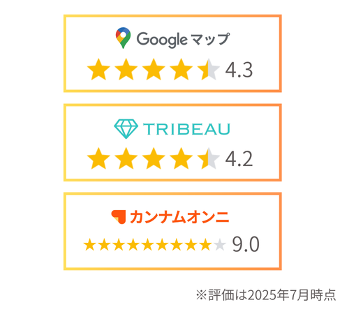 当院は、GoogleMAP・トリビュー・カンナムオンニで多くの高評価レビューをいただいています。実際に施術を受けたお客様からの紹介でご来院いただく方も多数。
